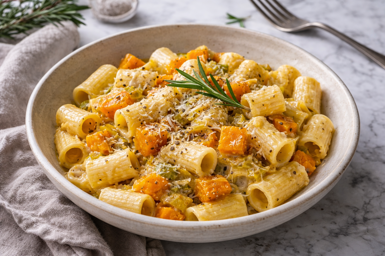Pasta corta con crema di patate, salame croccante e rosmarino