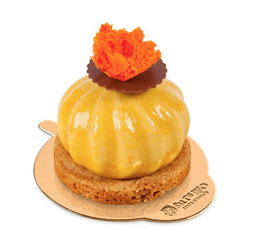 La monoporzione Bacio Caraibico di Sal De Riso, cuore di ananas alla vaniglia, mousse al cioccolato biondo (Dulcey) al frutto della passione e glassa al mango Alphonso. Qui.