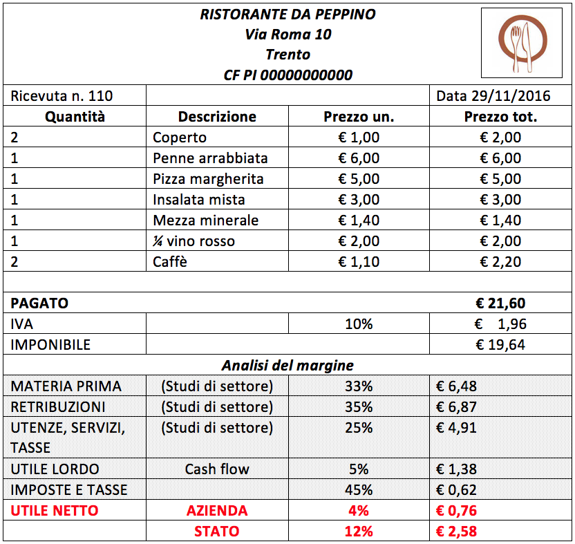 La Confcommercio dei Ristoratori del Trentino ha provato a fare un po’ di conti in tasca al ristoratore partendo dalla regola del tre che lo Stato applica in fase di verifica, ovvero: 1, costo della materia prima: non deve superare il 33% del fatturato. 2, costo delle retribuzioni: non deve superare il 35% del fatturato. 3, costi fissi: non devono superare il 25% del fatturato.