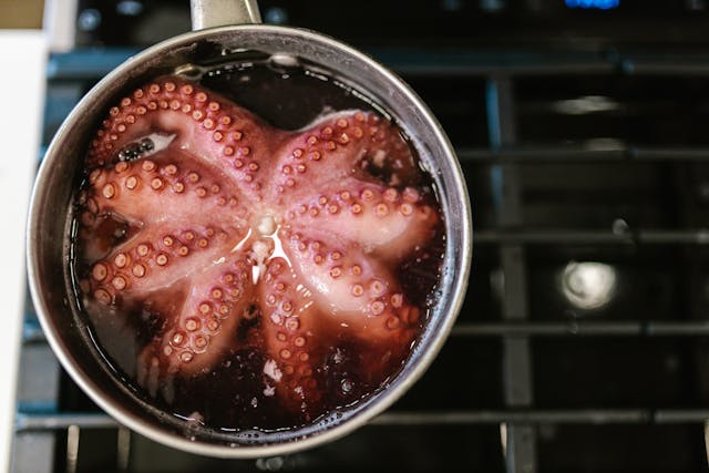 Cuoci il polpo, scolalo e lascialo raffreddare. Una volta raffreddato, taglialo in pezzi di circa 5 cm. Scalda una padella con un filo d’olio e uno spicchio d’aglio schiacciato. Fai rosolare i pezzi a fiamma viva per 2-3 minuti per lato, finché non risultano croccanti. Sfuma con il vino rosso, aggiusta di sale e pepe e lascia ridurre, girando spesso, fino a quando il vino si sarà trasformato in una glassa densa che avvolge il polpo.