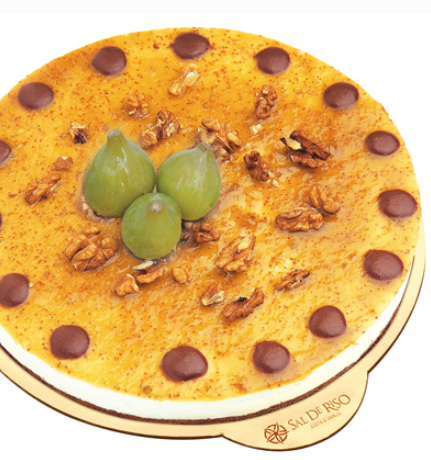 Si tratta di una torta composta da biscotto alle noci e cacao, crema ai fichi bianchi e cioccolato. Lo stesso consiglia di impreziosire l’impiattamento con una sua salsa al cioccolato aromatizzata al liquore e di abbinare o il Sagrantino Montefalco Passito o il Recioto.