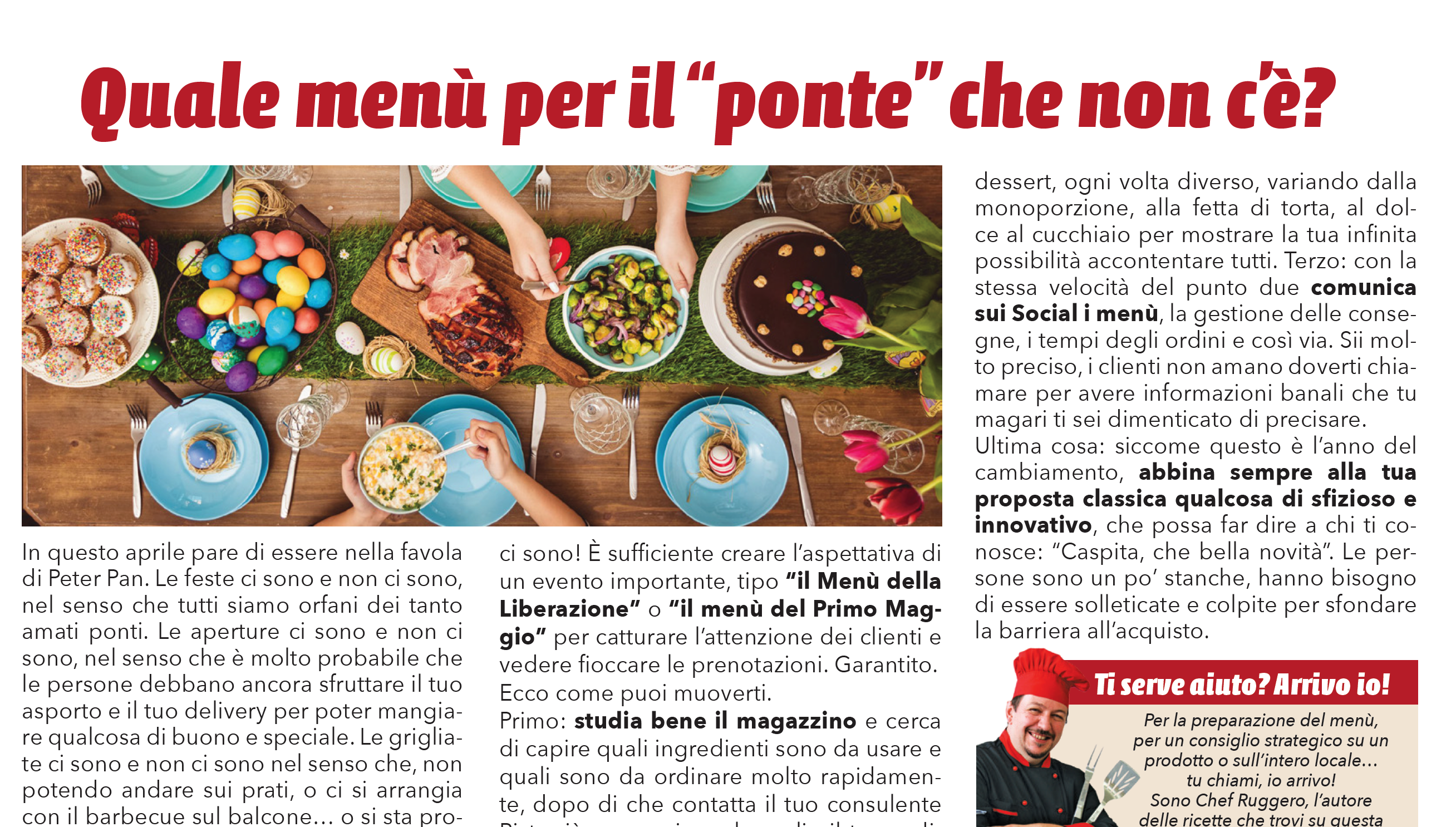 In questa Italia che appare surreale tu hai il potere di fare diventare tutto estremamente reale! Profumato, buono e gustoso, proprio grazie ai ponti che non ci sono! È sufficiente creare l’aspettativa di un evento importante, tipo “il Menù della Liberazione” o “il menù del Primo Maggio” per catturare l’attenzione dei clienti e vedere fioccare le prenotazioni. Garantito.