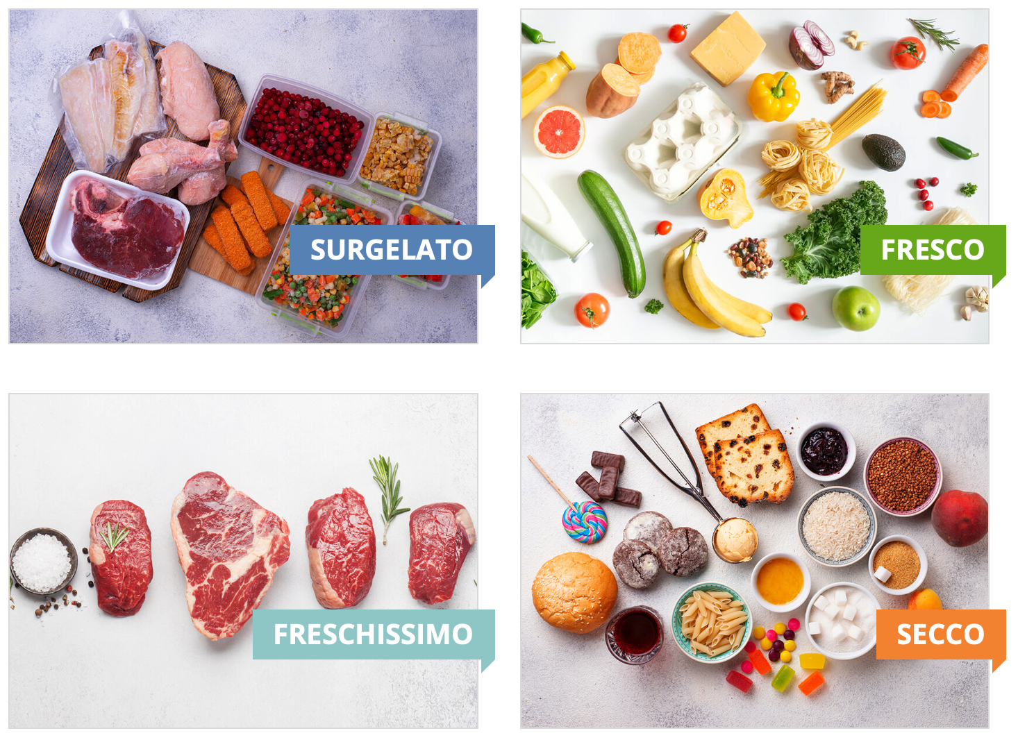 -i prodotti divisi per categorie: Surgelato, Fresco, Freschissimo Secco, Spirits, Enoteca